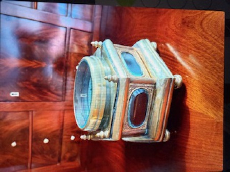 Diese Uhr verkörpert äußerlich die typische Form dieser speziellen Uhr. Sie ist aus Messing, in sechseckiger Ausführung. Im Innern befindet sich ein Uhrwerk mit 14-tägiger Gangdauer.