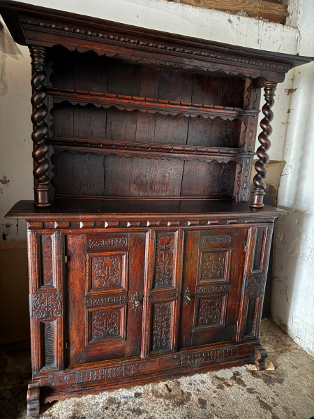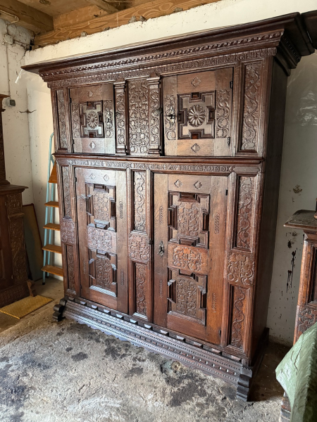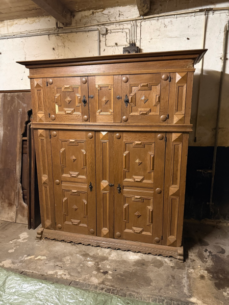 Der Dielenschrank ist aus massiver Eiche und wurde fachmännisch in 5 Teile zerlegbar gemacht, sodaß ein Transport auch über Treppen in obere Räume möglich ist.
